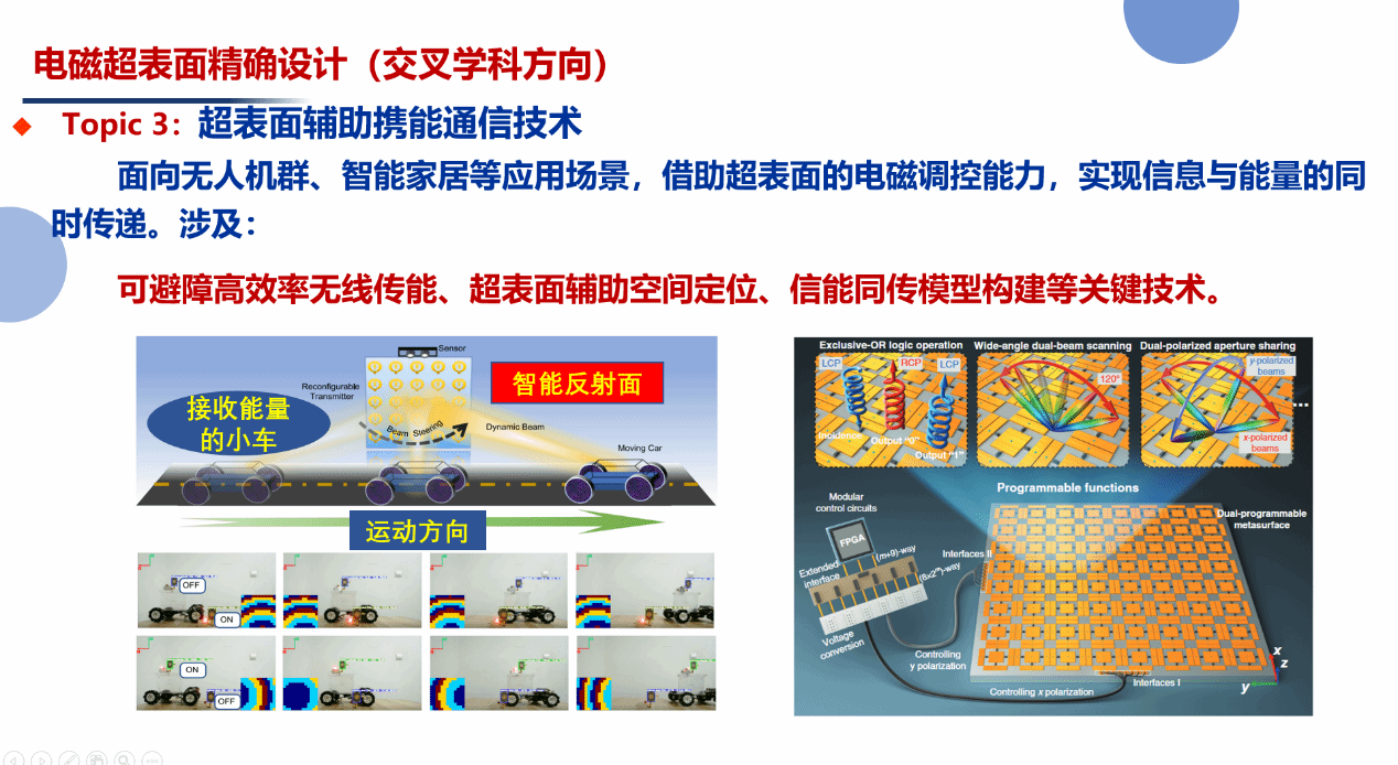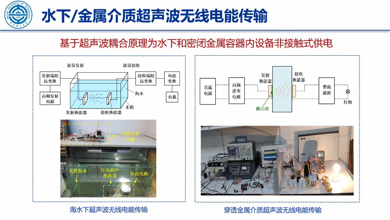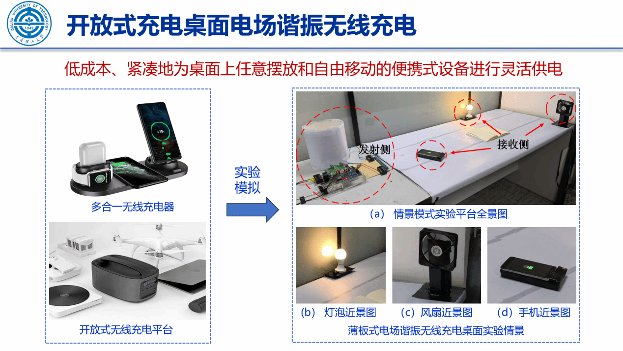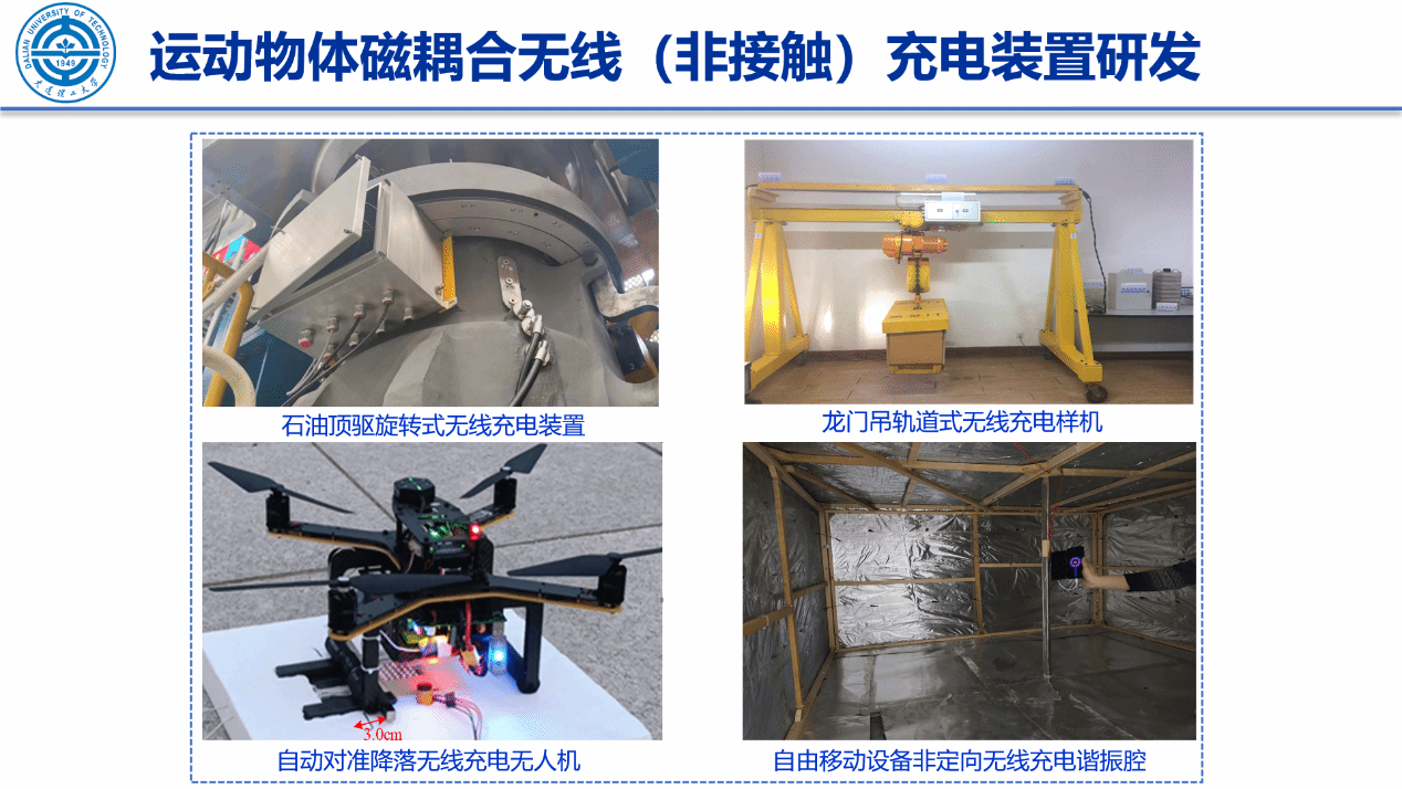 无线传能装备:构建磁耦合、超声波、单导线等多类型无线传能系统,实现 5km/5kW(87% 效率)、100m/300W 等不同场景下的高效供电,研发开放式充电桌面、水下无线供电等原型装备。